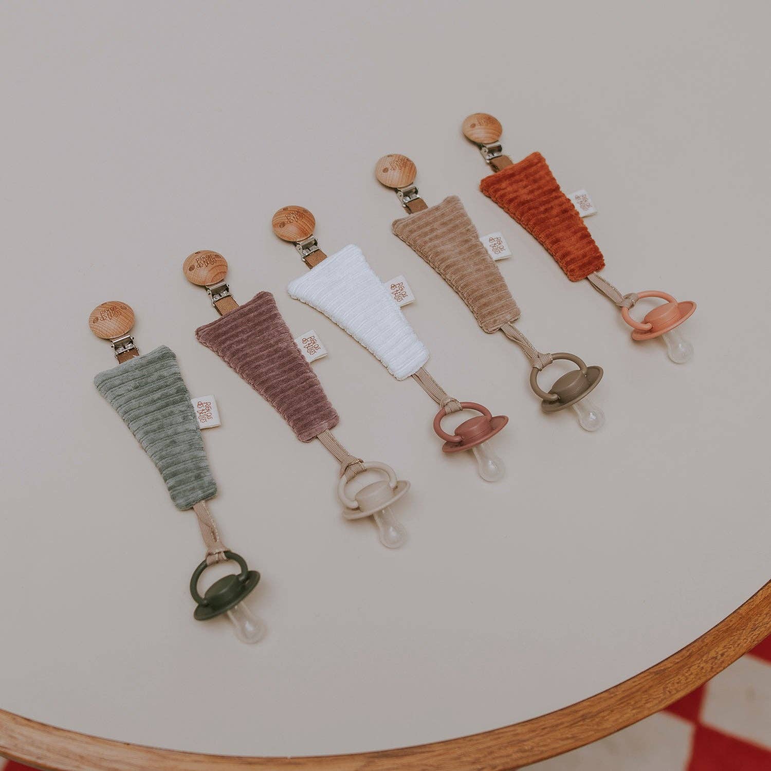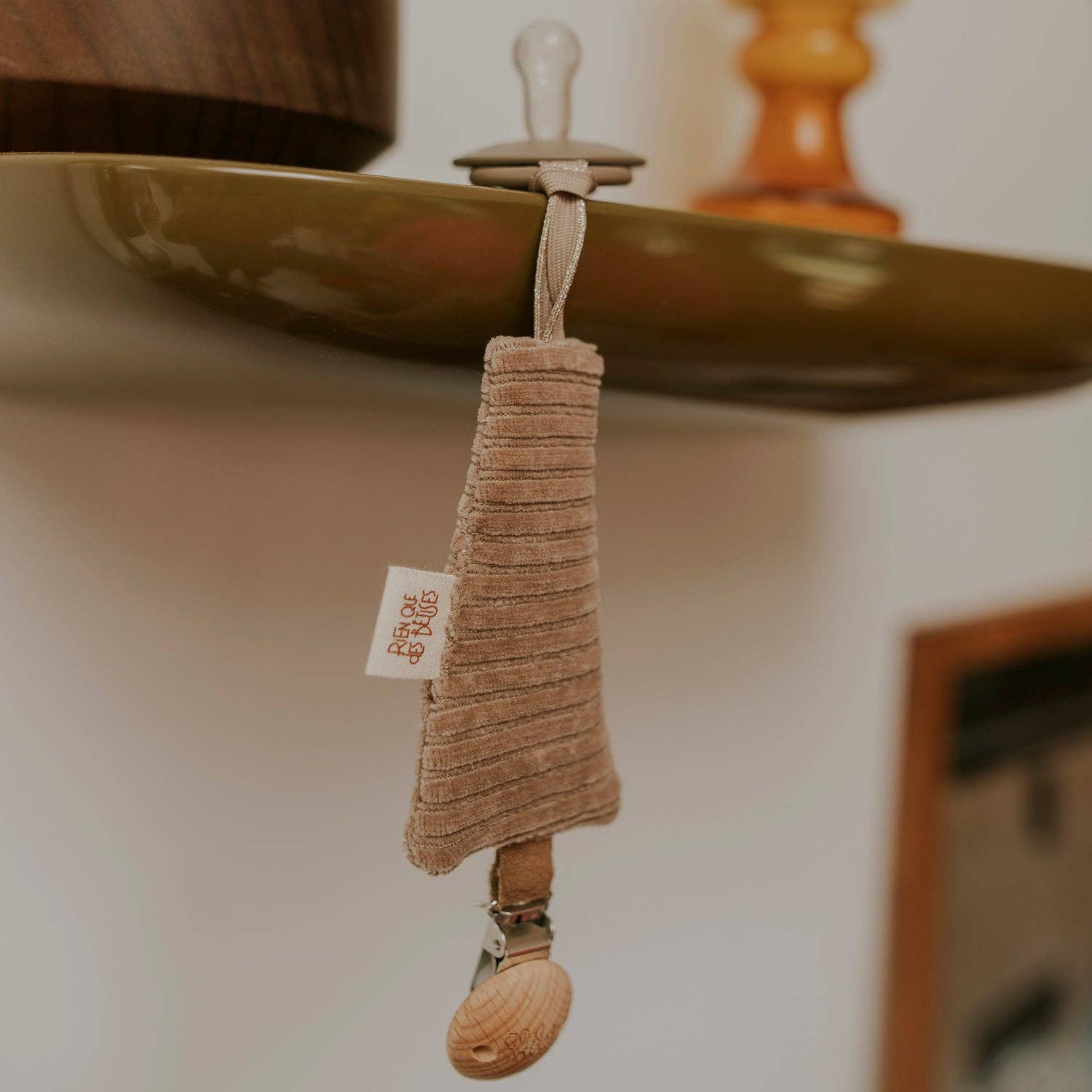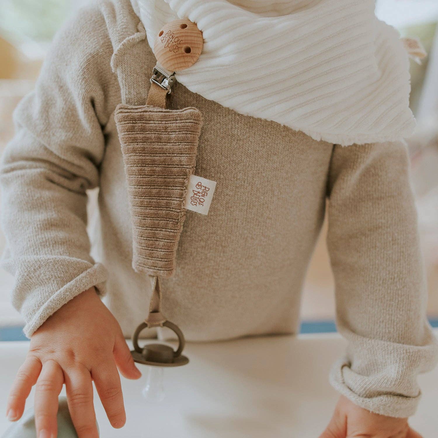 Craquez pour notre jolie attache tétine en velours taupe, une création artisanale pensée pour le quotidien des tout-petits (et de leurs parents !).
