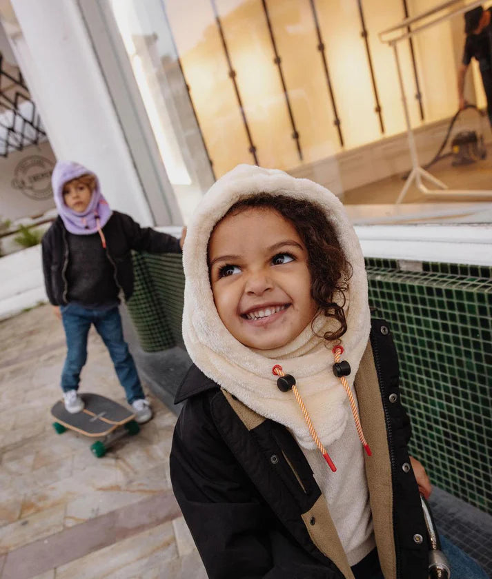 Pour garder votre enfant bien au chaud cet hiver, la cagoule Hello Hossy sera l'accessoire incontournable à avoir. Elle se transforme en tour-de-cou en un seul geste et elle est ajustable avec des liens.