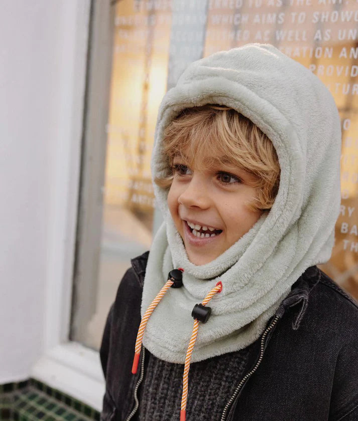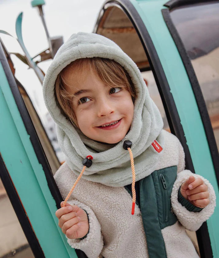 Pour garder votre enfant bien au chaud cet hiver, la cagoule Hello Hossy sera l'accessoire incontournable à avoir. Elle se transforme en tour-de-cou en un seul geste et elle est ajustable avec des liens.