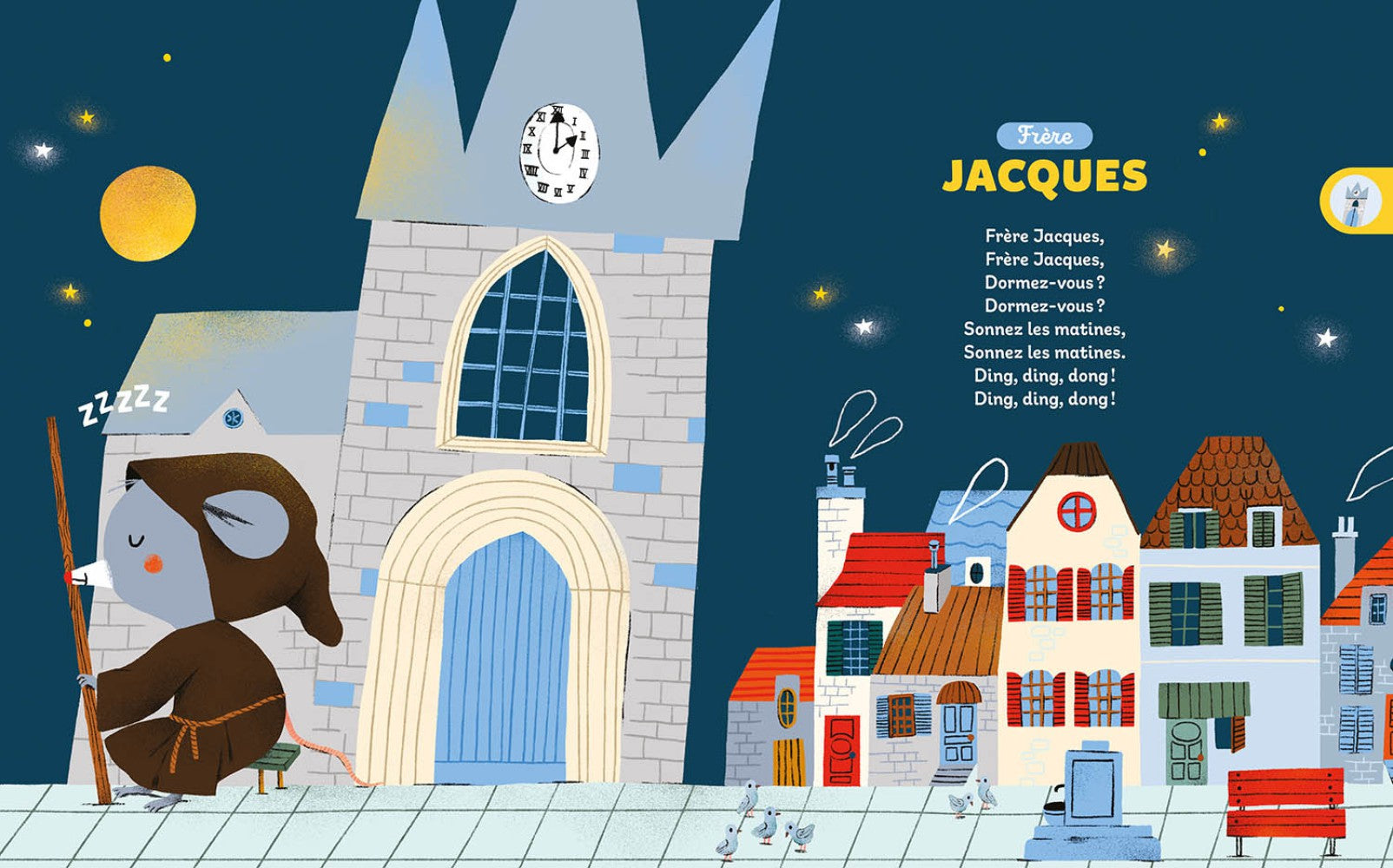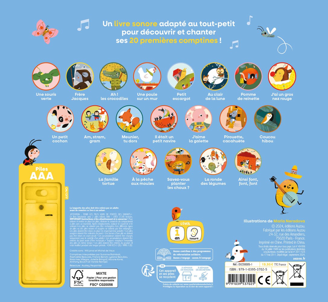 - un livre tout carton avec 20 comptines célèbres illustrées (avec les paroles pour chanter)
